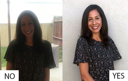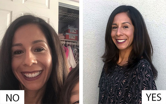 Do you prefer a head or chin tilt? Have a favorite side? Now is the time to work with a variety of poses to capture that perfect picture. Stand at an angle away from the camera but remember to always turn your head turned toward the camera. And do not zoom in. Instead, leave space around your head and shoulders, as you can crop in tighter later.