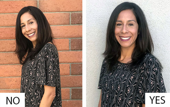 Resist a noisy background that takes the focus off you. Aim for a bright, neutral background like a white wall or a simple background. To keep from blending into the background, select clothing that contrasts with the backdrop.