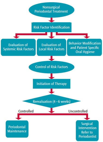 Nonsurgical therapy is considered the gold standard for the initial treatment of inflammatory periodontal disease. Indeed, nonsurgical treatment involving meticulous scaling and root planing has been extensively documented and has been shown to be a highly predictable and successful therapy.1 The main goals of nonsurgical periodontal therapy (NSPT) are to remove and control supra- and subgingival microbial biofilms, eliminate and control inflammation, and eliminate and control systemic and local risk factors that contribute to disease development and progression. Depending on the degree of bony involvement, effective NSPT may minimize or eliminate the need for surgical intervention. Hence, the seven-step protocol described here (Figure 1) will enable clinicians to identify and modify local and systemic risk factors, facilitate decisions about the use of systemic or locally delivered antibiotics, and prescribe appropriate oral hygiene measures. However, not all periodontal diseases can be successfully managed with a nonsurgical approach.