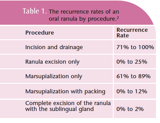Treatment for a simple ranula involves excision of the lesion. Another method is simple marsupialization or incision of the cyst creating a pouch and suturing of the ranula followed by packing of the entire cyst cavity with gauze for 7 days to 10 days. This technique is not widely accepted because the recurrence rate is high in large lesions. An alternative approach is the complete removal of the ranula and its major salivary gland. Laser ablation and cryo surgery alone or after marsupialization are also used to treat ranulas. See Table 1 for recurrence rates. The cervical/ plunging ranula is best treated by complete surgical excision of the lesion and the sublingual gland.