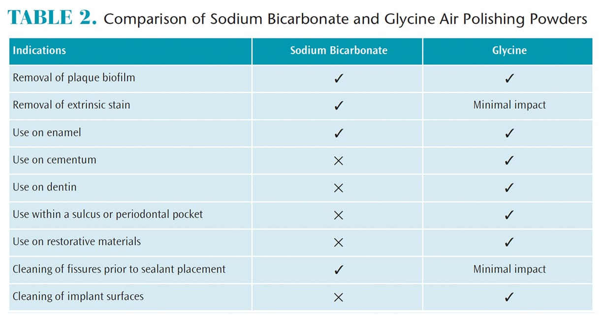 Other advantages of glycine powder subgingival air polishing include time efficiency, less operator fatigue, no heat production for dental surfaces, and more effective removal of biofilm in pits and fissures. When compared to sodium bicarbonate, glycine powder has fewer contraindications for use (Table 2). One limitation of using the glycine air polishing device is that additional clinical training is recommended for proper subgingival biofilm removal techniques. Glycine powder is not as effective at removing tenacious stain when compared with traditional sodium bicarbonate powder.