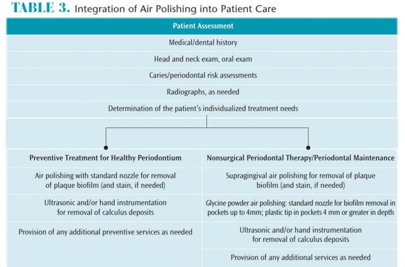 Integration of air polishing affords the oral health professional new options and an enhanced approach to patient care. When determining the most effective technologies for individualized care, consideration must include evidence of oral disease, presence and level of biofilm and stain, and overall health status. Healthy individuals with stain may be better candidates for traditional supragingival air polishing using sodium bicarbonate. On the other hand, patients with gingival disease may be better served by subgingival air polishing using glycine. Research has indicated the use of subgingival air polishing prior to calculus removal has an advantageous approach to the dental hygiene process of care (Table 3).33
