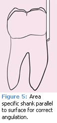 Once the terminal or toe-third of the blade is applied for correct adaptation, the instrument’s terminal shank provides visual cues to guide effective blade angulation. Since the blade cannot be observed once it is within the pocket, shank positioning and guidance are critical to establishing effective working angulation (Figure 7). The shank-tosurface orientation for either the area specific or the universal curet is maintained from stroke onset to completion, making each stroke perform to its maximum potential.