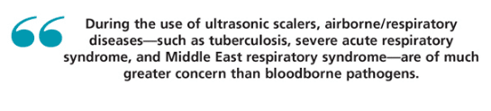 ANSWER: The primary route of contracting hepatitis B, hepatitis C, or HIV in the dental office is through exposure to blood, most commonly through percutaneous injuries (eg, needlestick or puncture with a sharp object) or splash to mucous membranes (during lengthy procedures, clinicians should also don a full-length faceshield in addition to a mask for added protection). The general population most commonly contracts these bloodborne pathogens through direct contact with blood or infected bodily fluids, unprotected sex, shared needles, or vertical transmission during labor and delivery. These pathogens are not as easily spread through airborne contact. HIV does not live long outside of the body, so it may not be as infectious in a droplet/airborne state. The transmission of hepatitis B and hepatitis C requires a high volume of viral load, which is probably not contained in the aerosol form. During the use of ultrasonic scalers, airborne/ respiratory diseases—such as tuberculosis, severe acute respiratory syndrome, and Middle East respiratory syndrome—are of much greater concern than bloodborne pathogens. The use of ultrasonic instrumentation is contraindicated for patients with respiratory illness.