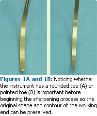 The most important goal in maintaining instrument sharpness is to preserve the original shape and contour (Figure 1A and Figure 1B). Before beginning sharpening, ask two questions: