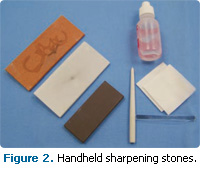Manual sharpening is an effective method for preserving instrument shape and contour. Stone selection should be based on the dullness of the instrument. Fine to medium stones are necessary for routine sharpening and a coarse stone is best for extremely dull cutting edges. A two-sided abrasive surface (medium on one side and fine on the other) is an efficient option. While some stones must be treated with water or oil, many do not require lubrication.