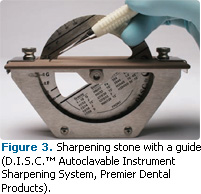 Instruments should be sharpened at the first sign of dullness. A sharpening work station incorporated into the dental hygiene treatment room allows clinicians to react quickly when instruments become dull. Several sets of sterile stones and test rods should be available so sharpening can be conducted quickly prior to seating patients and during treatment when an instrument may become noticeably dull (Figures 2-4).