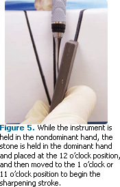 The stationary instrument/moving stone technique relies on the clock face for instrument positioning. While the instrument is held in the nondominant hand with the face of the blade parallel to the floor, the stone is held in the dominant hand and initially placed at the 12 o’clock position and then moved to 1 o’clock or 11 o’clock to activate the sharpening stroke (Figure 5). By looking down onto the face of the instrument blade, the dental hygienist can visually see the contour of the cutting edge and closely follow it with the stone (Figure 6).