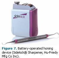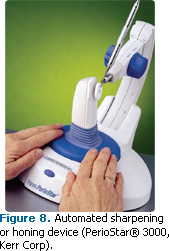 A honing machine is one example of an automated sharpening device (Figure 7-Figure 8). It can be a bench-type or smaller battery-operated piece of equipment that follows the principles of instrument preservation. Specially designed honing disks are mounted on top of the machine, and rotate up to 7,000 rpm. These devices will remove metal from either the face or lateral sides of the blade as the clinician controls the pressure. If the metal is being removed from the lateral sides of the cutting edge, the dental hygienist must be able to maintain the pendulum-like motion from heel to toe to preserve the gentle curve of the Gracey cutting edge or the flame-shaped cutting edge of some sickles. In addition, clinicians must be confident in instrument positioning and application of pressure.