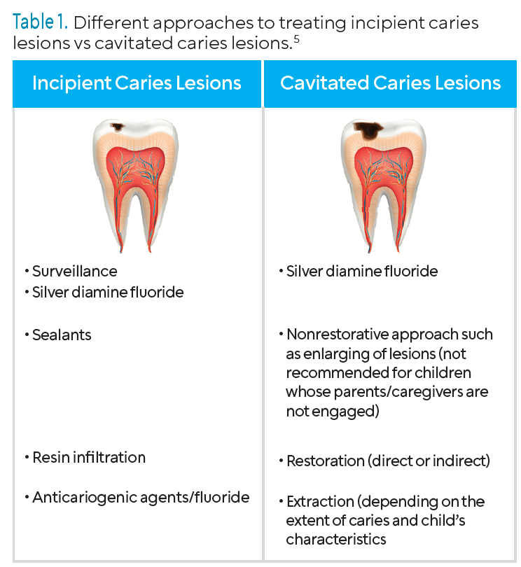 The authors found minimally invasive 38% silver diamine fluoride (SDF) recommended for both cavitated and noncavitated carious lesions.5 A systematic review within the scoping review further concluded and supported SDF’s ability to arrest cavitated and noncavitated lesions.23 The World Health Organization also supports this recommendation.1