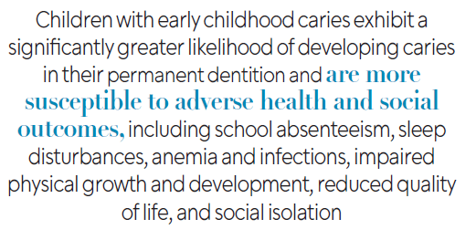 When compared to children without ECC, children with ECC exhibit a significantly greater likelihood of developing caries in their permanent dentition and are more susceptible to adverse health and social outcomes, including school absenteeism, sleep disturbances, anemia and infections, impaired physical growth and development, reduced quality of life, and social isolation.8-11