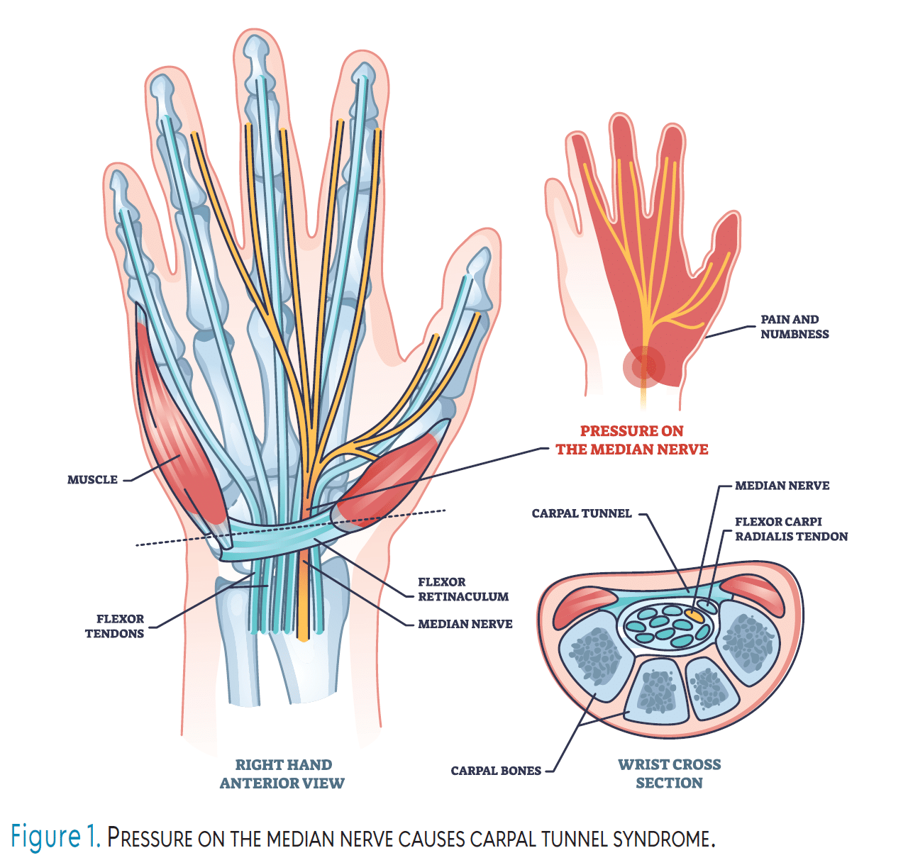 Carpal tunnel syndrome (CTS) occurs when the median nerve, which runs through the narrow carpal tunnel in the wrist, becomes compressed (Figure 1, page 21).1,2 This nerve provides sensation to the thumb, index, middle, and part of the ring fingers, while also controlling some muscles at the base of the thumb.1 Common symptoms of CTS include numbness, tingling, or a “pins and needles” sensation, particularly in the thumb and fingers, along with pain or discomfort in the wrist, hand, or forearm. Symptoms tend to worsen at night or in the morning due to increased pressure on the median nerve from wrist flexion during sleep and fluid buildup in the wrists.3