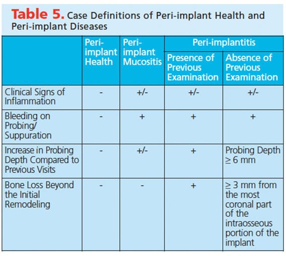 For these reasons, a clinical and radiographic exam is recommended within the first year of prosthesis delivery. In the event these data are not available, different criteria apply for the definition of peri-implantitis.22 An overview of the case definitions of peri-implant health, peri-implant mucositis and peri-implantitis is presented in Table 5.
