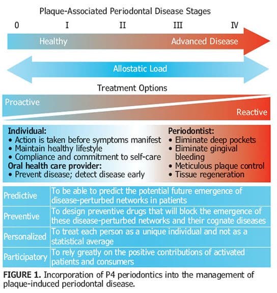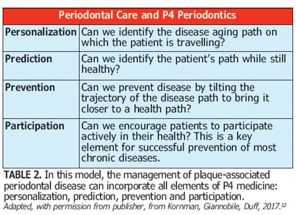 Current management protocols for plaque-associated periodontal conditions are reactive to the disease signs and symptoms. The P4 approach in medicine and periodontal care recognizes that chronic disease should be managed in a more proactive manner, with the goal of achieving healthy aging. It embraces four key aspects of health care, leading to a truly holistic approach. Using the themes of prediction, prevention, personalization, and participation, patients and health care providers work as a team to promote health and well-being—throughout life and across the health continuum, from health to advanced disease. The basis of this model is data gathering and taking a systems approach through the use of sophisticated and ever-evolving technologic advances, multilevel interdisciplinary interactions, and a fully participating patient.