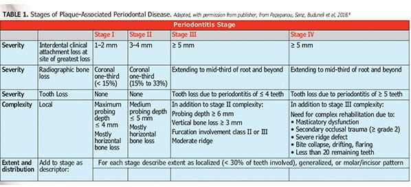 The new classification system arising from the World Workshop on Classification of Periodontal and Peri-Implant Diseases recognizes that plaque-associated periodontal diseases represent a spectrum of conditions ranging from periodontal health to advanced, dentition-threatening disease.5 For the first time, periodontal health has been clearly defined.6,7 With an accepted definition of periodontal health, it is now possible to define plaque-associated periodontal diseases through a sequential series of stages (Table 1) and grades of severity.