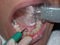 Figure 4. An aerosol reduction device (JetShield™ Cavitron®) being used during air polishing. This device will reduce aerosol and bacterial contamination by 97%. A high volume evacuator is ineffective for controlling the aerosol from an air polisher due to the ricochet phenomena. |