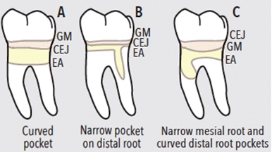 The topography of the periodontal pocket requires analysis. Periodontal pockets can be wide and curved (bathtub shaped) or narrow and long (cylindrical shaped). The pocket shape could also be wide and narrow or complex, such as a spiral pocket curving from one surface to another (Figure 1).