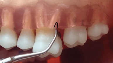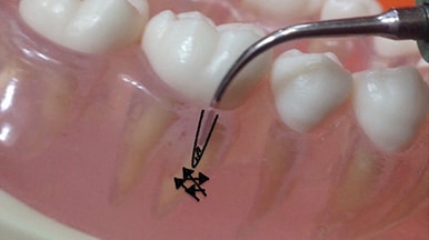 As described above, calculus removal will progress from the GM to the EA, initially by engaging the end of the UIT with a tapping motion to fracture calculus from its top edge, moving apically. The narrow nature of the pocket indicates a mostly vertical approach with the tip. An oblique or bisecting approach will not be effective in reaching all sides of the pocket due to the pockets’ restricted width and depth.