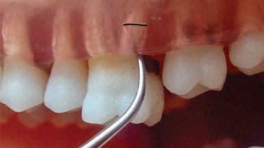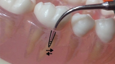 The second stage of periodontal debridement occurs after the large deposits are removed. For deposits in bathtub-shaped pockets, oblique strokes from the EA to the GM are activated adapting the active tip area (eg, 2 mm to 3 mm) (Figure 5). Horizontal and vertical strokes are also used to thoroughly remove plaque biofilm and calculus.