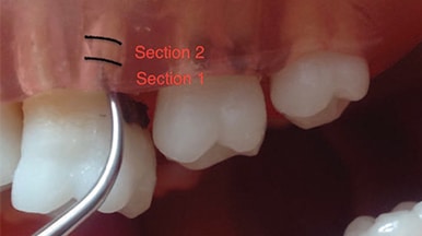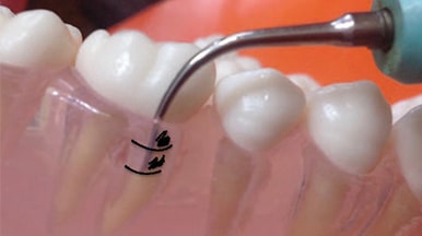 Decide if the pocket can be debrided in its entirety from GM to EA (Figure 3) or if it would be advantageous to divide the pocket into sections (Figure 4). Concentrating on activation in these two sections aids in thorough debridement. The coronal most portion can be instrumented, followed by instrumentation of the apical section. This decision depends on the topography of the pocket, type of calcified deposits within the environment, and where the calcified deposits are located on the root.