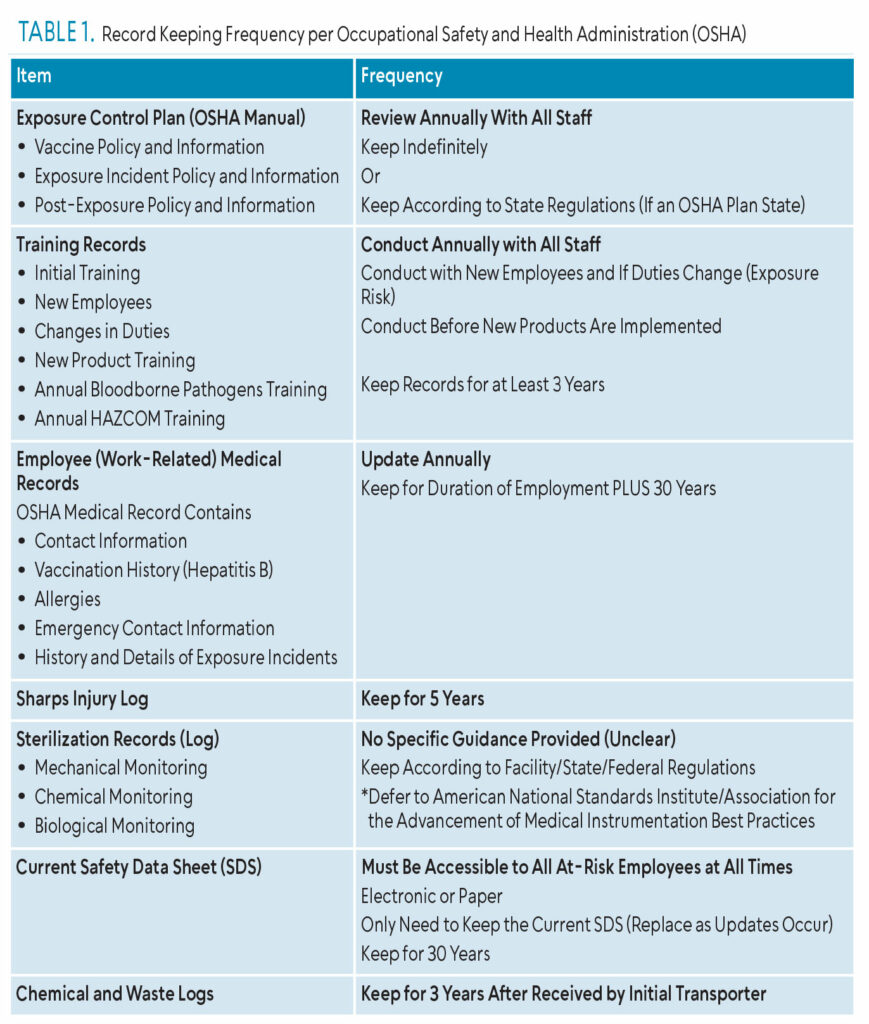 Record keeping for all OSHA documents and compliance is varied. Table 1 outlines the type and required frequency of OSHA records. The exposure control plan containing vaccine information, exposure incidents information, and post-exposure information must be reviewed at least annually and kept indefinitely.12