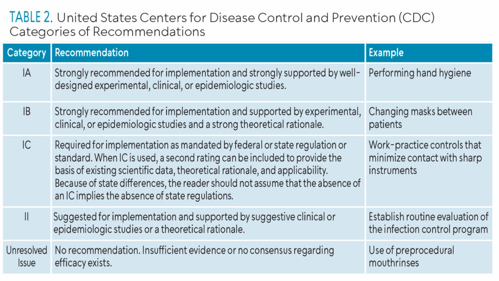 Table 2 outlines recommendations and provides examples. The CDC also includes guidance for safe practices related to hand hygiene, PPE, latex hypersensitivity, sterilization and disinfection of instruments, storage of instruments, environmental infection control, dental unit waterlines, handpieces, radiology equipment, single-use disposable items, parenteral medications, pre-procedural rinsing, handling of biopsy specimens, dental laboratory, laser smoke, and prion diseases.6,7