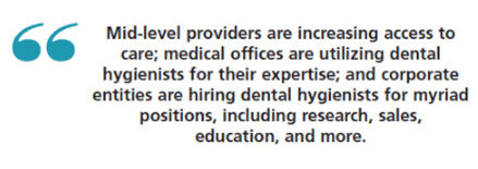 As the new year begins, we often focus on how we can improve ourselves. We may vow to implement healthy habits, such as exercising more frequently and eating nutritious foods. These efforts are laudable and sometimes yield positive results. But what about your dental hygiene career? Have you thought of ways to improve this important aspect of your life? The supplement Perspectives on Dental Hygiene, which was published with the October 2014 issue of Dimensions of Dental Hygiene, demonstrated that our profession is rapidly changing. In order to remain relevant and essential, we need to rethink our roles in health care. Expanded opportunities for dental hygienists already exist, and they will continue to grow. Dental hygiene practice is no longer confined to a four-wall operatory, but it is now much broader in scope. Mid-level providers are increasing access to care; medical offices are utilizing dental hygienists for their expertise; and corporate entities are hiring dental hygienists for myriad positions, including research, sales, education, and more. Just like the leaders featured in the “Six Dental Hygienists You Want to Know” online forum, I’m frequently asked how to step out of the operatory to try something new. The answer is—it begins with you.