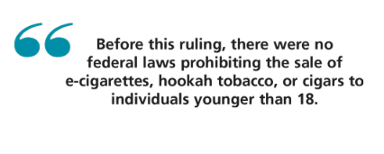 Some important stipulations in the FDA’s ruling pertain to the sale of e-cigarettes and tobacco products to minors. Health and Human Services Secretary Sylvia Burwell stated in a press release, “Today’s announcement is an important step in the fight for a tobacco-free generation. It will help us catch up with changes in the marketplace, put into place rules that protect our kids, and give adults the information they need to make informed decisions.” Before this ruling, there were no federal laws prohibiting the sale of e-cigarettes, hookah tobacco, or cigars to individuals younger than 18. The press release outlines the new regulations regarding the sale of tobacco products to minors: