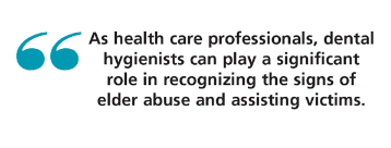 We can no longer turn a blind eye to the problem of elder abuse. As health care professionals, dental hygienists can play a significant role in recognizing the signs of elder abuse and assisting victims. We owe that to our seniors who have given so much to us.