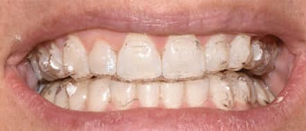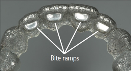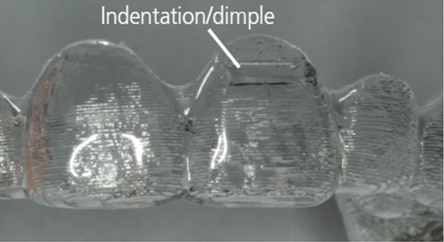 Modern aligners include a host of optional features that may improve efficacy. Built-in bite ramps can be placed on the outside surface of the aligner to create an anterior vertical stop to prevent excessive bite force on molars (Figure 8). Aligner indentations/dimples help with root position (Figure 9, page 35), and cutouts for interarch elastics can also aid treatment. Auxiliary appliances, such as elastics or Class II or III bite correctors, as used with traditional braces, may be combined with aligner therapy. Prior to commencing treatment, clinicians should have a full understanding of the application of each system. It is imperative that treatment is monitored regularly by a dentist or specialist to make adjustments and avoid adverse outcomes.