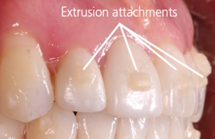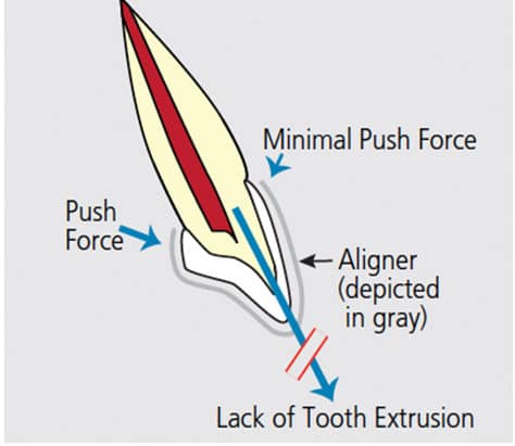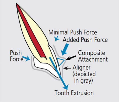 Aligners produce tooth movement by pushing, rather than pulling, on teeth. Compared with lingual or buccal braces that produce push-and-pull forces, this places aligners at a distinct disadvantage. The natural anatomy of teeth can make certain types of orthodontic movement with aligners difficult. Tooth extrusion is one example. The lack of sufficient undercuts at the gingival margins of a tooth makes pushing it into a more extruded position nearly impossible. To address this, an undercut can be created by bonding composite to the tooth. Using the created undercut, a tooth can be pressed or squeezed into the aligner in an extrusive direction (Figure 5 to Figure 7).