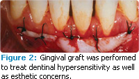 A prominent labial frenum was also noted. As seen in Figure 1, at only 4 weeks post-scaling and root planing, the patient was already forming new calculus on several teeth. Connective tissue grafting was recommended to improve the gingival architecture in the area and to cover the exposed root surfaces. Figure 2 shows connective tissue grafts immediately following suturing but prior to the placement of a periodontal pack. A frenectomy was also performed. Figure 3 depicts the treated area 2 years later. Comparing Figure 1 to Figure 3, note the wider band of attached gingiva and substantial root coverage on the labial aspects of #23—#25 post-treatment. Unfortunately, the patient’s self-care remained suboptimal. The patient reported that DH had persisted for several months following the grafting procedure but “had been gone for 2 years or so now,” and he continued to use a desensitizing dentifrice twice daily.