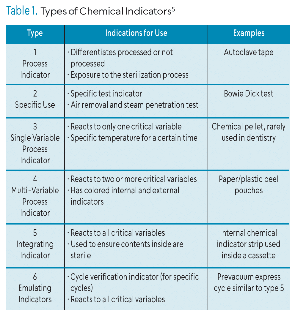 While biological indicators (BIs), or spore tests, are the most reliable method for monitoring sterilization, CIs also play a vital role in daily sterilizer performance checks. Used alongside BIs, CIs offer additional layers of assurance and are essential for maintaining quality control in sterilization procedures. Table 1 outlines the six types of CIs.
