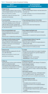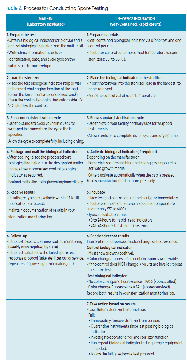 Biological monitoring evaluates whether a sterilization cycle effectively kills highly resistant microorganisms, typically bacterial endospores from Geobacillus stearothermophilus or Bacillus atrophaeus.1 This form of testing can detect failures in the sterilization process that may not be identified by mechanical means or CIs alone. Two methods are commonly used in dental offices: in-office testing kits and mail-in biological monitoring services. Table 2 outlines the process for conducting both methods of spore testing.