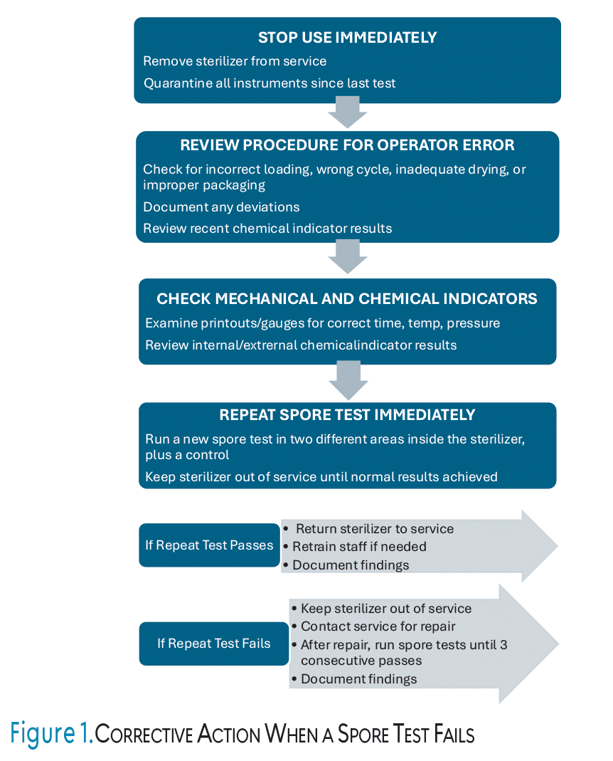 Regardless of the testing method used, documentation and recordkeeping are essential for OSHA compliance.2 Sterilizer monitoring records must be maintained for 1 to 3 years depending on state regulations and should include date, sterilizer used, type of test, results, and actions taken if results indicate failure.2 The CDC recommends maintaining records for 3 years.1 Dental practices should develop written policies that outline procedures for biological monitoring and corrective actions in the event of sterilization failure. Figure 1 outlines the steps and corrective action needed when a spore test fails.