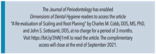 A recently published paper in the Journal of Periodontology, “A Re-Evaluation of Scaling and Root Planing,” reviews the peer-reviewed literature on calculus, biofilm, scaling and root planing, and periodontitis.1 The paper, which includes original scanning electron photomicrographs of surface and cross-sectional views of diseased roots magnified more than a 1,000 times, can be accessed here: https://bit.ly/3hWj1mK through the end of September 2021.
