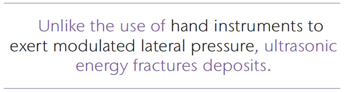 During power-driven instrumentation, a pattern of calculus removal should be implemented to prevent leaving fragments behind, missing surfaces, and burnishing deposits. Compared to manual instrumentation, the pressure used in ultrasonic scaling is often lighter. Unlike the use of hand instruments to exert modulated lateral pressure, ultrasonic energy fractures deposits. The very firm lateral pressure applied in manual instrumentation is not necessary with ultrasonic instrumentation.