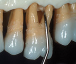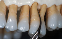 Thin-tipped inserts are especially effective in reducing spirochetes and motile rods in class II and III furcations10 (Figure 1) and should routinely follow the use of mini-bladed manual instruments in these areas.11 Positioning of thin ultrasonic tips featuring a straight terminal portion is identical to probing. The tip is directed apically, while the last 1 mm to 2 mm of the side are in contact with the tooth. Observe care in furcations to prevent perpendicular tip contact, which will gouge the root.
