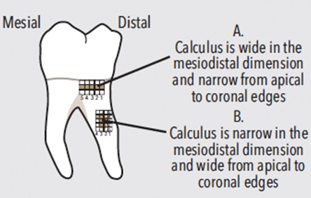 The same furcation anatomy occurs adjacent to the furcation entrances on the buccal, mesial, and distal surfaces of the maxillary first molars (Figure 4 and Figure 5). Therefore, crosshatching in the widest aspect of the concavity adjacent to the furcation entrance is indicated (Figure 4). The challenge in these locations is the length and shape of the concavity leading to the furcation entrance, as it is irregular in shape and the furcation entrance is located further apically than on the mandibular first molars.