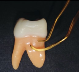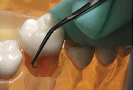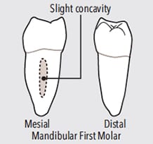 A long, subtle vertical concavity is located on the mesial surface of mandibular first molars (Figure 9). This anatomy requires significant rolling of a curet from the buccal to mesial surface to reach into the approximately 1 mm depth of the concave surface to effectively debride the root (Figure 10). Reaching the depth of this concavity, or other concavities, can be problematic if too much of the blade’s length is adapted to the mesial, causing the clinician to miss the interior of the narrow concavity. In this case, the middle one-third of the blade is adapted over the concavity, which prevents the blade from instrumenting within the concavity.