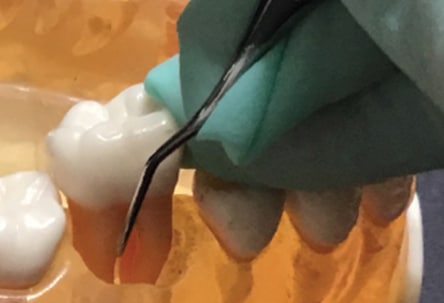 One approach for ideal fulcrum orientation and placement is to position the instrument’s working end at the epithelial attachment, move your grasp up the instrument handle, and place your fulcrum on an adjacent tooth or oral facial tissue to meet the need of the instrument placement.2 An opposite arch fulcrum with a palm up orientation is particularly useful for maxillary molars (Figure 1).