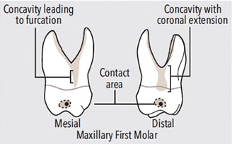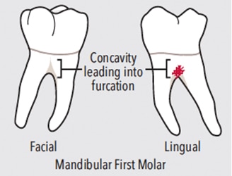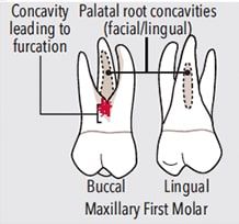 A vertical concavity is located on the lingual surface of maxillary first molars (Figure 4). It starts in the middle one-third of the root and extends apically; therefore, it will be treated only when the clinical attachment loss exposes this concavity. Mini-bladed Gracey curets are excellent choices for these concave areas.
