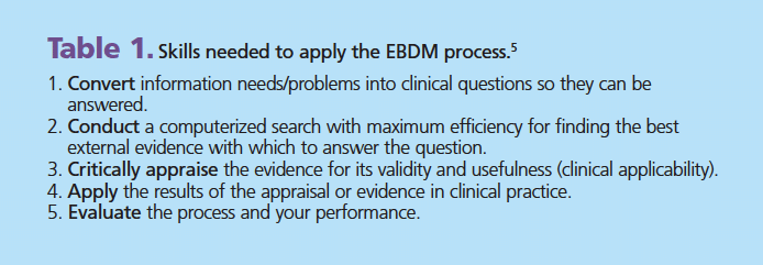 One approach to help clinicians bridge the gap between current research evidence and practice protocols is through self-directed evidence- based decision making (EBDM).3 EBDM is defined as “the integration of best research evidence with clinical expertise and patient values.”4 As a result, practitioners need more efficient and effective online searching skills to find relevant evidence, and critical appraisal skills to rapidly evaluate the evidence for its validity and applicability. Table 1 outlines the skills related to the EBDM process.5