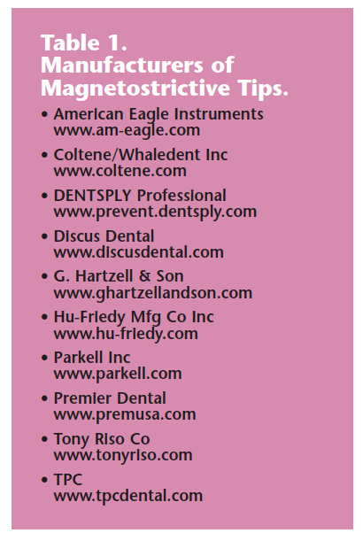 Several manufacturers make magnetostrictive ultrasonic inserts that come in many different designs ranging from large diameters to small to thin inserts for better access into root furcations (see Table 1 for a list of manufacturers). Tips to improve clinician ergonomics are available, such as the Swivel™ line of tips,* which are designed to allow for single-handed adjustment, and Big Easy® ultrasonic inserts,** which offer a wide diameter and cushioned grip to improve comfort and ergonomics. Aerosolized bacteria can be an issue when using ultrasonic instrumentation, and tips designed to reduce this risk and increase visibility by providing a fixed water flow (Infinitip Magneto Inserts***) are available.