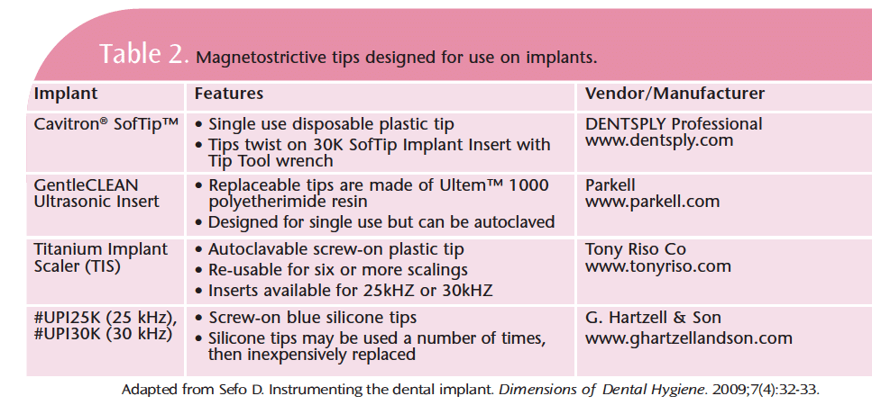 Tips designed to scale implants are also new additions to the magnetostrictive market. Prior to their introduction, it was very difficult to remove plaque and calculus around titanium implants and abutments with ultrasonic scalers for fear of damaging the restoration. Table 2 provides information about the magnetostrictive tips that are safe to use on implants. Implant tips are typically plastic, disposable ultrasonic insert tips that deliver the same lavage as other inserts. They should be used on a low setting.