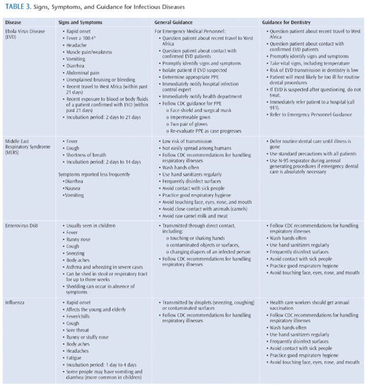 Disease outbreaks are in the news every day. Most recently, reports of Ebola, Middle East respiratory syndrome (MERS), and enterovirus D68 have made headlines. Oral health professionals must be diligent in understanding the signs and symptoms of emerging infectious diseases, how they are spread, and how to prevent the further dispersal of these diseases.
