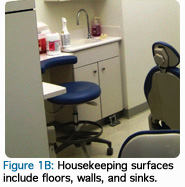 Clinical surfaces are divided into two categories: clinical contact surfaces (Figure 1A), and housekeeping surfaces (Figure 1B). Clinical contact surfaces are subject to aerosol contamination created by handpieces and ultrasonic scalers, or surfaces that come in direct contact with clinicians’ gloved hands (light handles, switches, drawer pulls, chair and equipment buttons and control knobs, chairside computers, faucet handles, and countertops). Although these surfaces have not been implicated in the transmission of diseases to patients or dental professionals, they can serve as a reservoir for microbial contamination.1