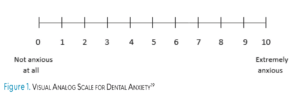 The most widely accepted questionnaires to assess dental anxiety include the single-item visual analog scale, or VAS (Figure 1), Corah’s dental anxiety scale (CDAS), and modified dental anxiety scale (MDAS).19,20 The VAS consists of a horizontal line with numbers ranging from 0 to 10, with lower numbers indicating less dental anxiety and higher numbers indicating greater dental anxiety.19,21 Patients self-report how anxious they feel by giving a number from 0 to 10. The VAS typically takes less than 1 minute to complete.