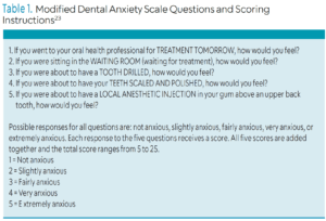 Assessments enable oral health professionals to identify patients experiencing dental anxiety and determine the severity of their dental anxiety. Several types of assessment methods are available, including single-item questionnaires and multiple-item questionnaires.19 A single-item question listed on the dental history form may be “Are you afraid of going to the dentist?” Alternatively, more thorough questionnaires are available to assess dental anxiety.