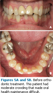 Crowding of the teeth can make it difficult to perform effective interproximal oral hygiene (Figures 5-6). This type of crowding also tends to make adequate brushing and flossing difficult, which encourages the formation of calculus.
